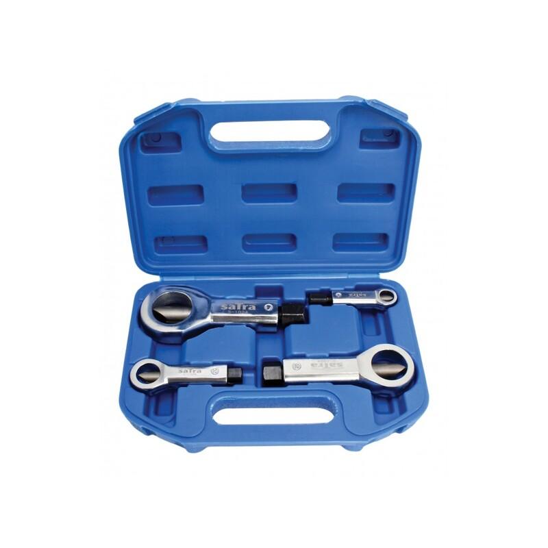 A S-1024-Satra Anyacsavar roppantó készlet 9-36mm 4 részes speciális szerelőeszköz-készlet, amely tökéletes megoldást nyújt mind professzionális, mind otthoni beragadt anyacsavarok eltávolítási munkáihoz. A tartós anyagból készült 4 részes roppantó készlet hatékonyan működik különböző méretű anyacsavarokon, megkönnyítve és lehetővé téve a problémás kötőelemek eltávolításának munkálatait.