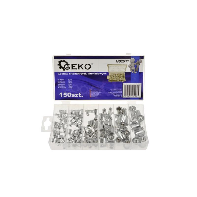 A G02911-Geko Szegecsanya készlet alumínium 150 részes átfogó rögzítőelem-gyűjtemény, amely tökéletes megoldást nyújt mind professzionális, mind otthoni szegecselt kötések készítési munkáihoz. A tartós alumínium anyagból készült 150 különböző méretű szegecsanya hatékonyan működik különböző anyagok összekapcsolásánál, megkönnyítve és gyorssá téve a szegecselési munkálatokat.